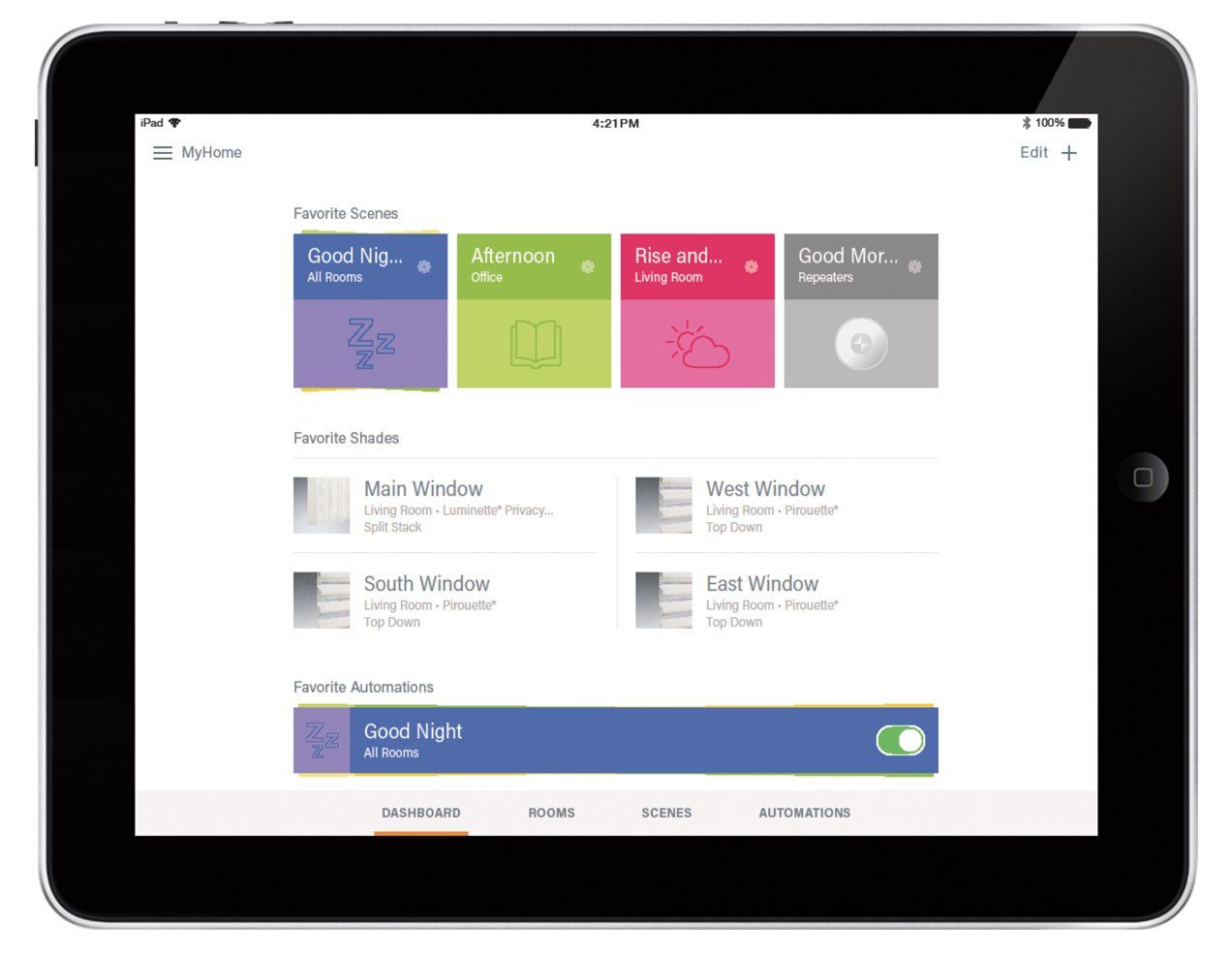 - Easily set up, operate & schedule personalized Scenes to move your shades to a specific position automatically throughout the day.